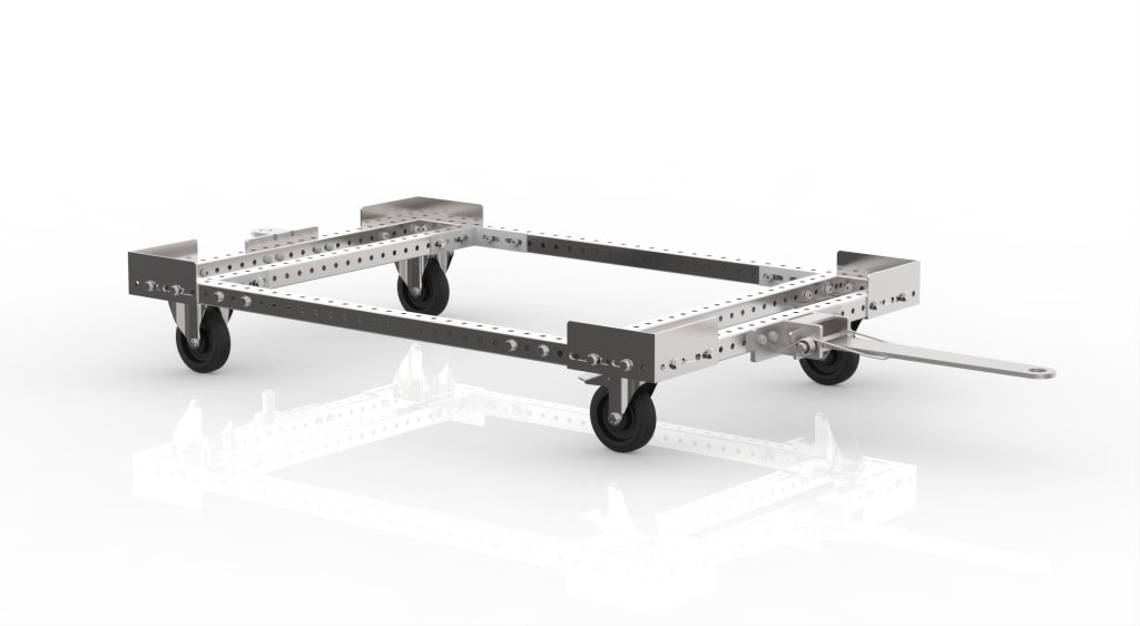 Podwozie manipulacyjne wykonane ze zmontowanych elementów stalowych o wymiarach 40x40 mm. Dzięki nośności do 750 kg idealnie nadaje się do transportu cięższych przedmiotów. 2 koła skrętne z hamulcem i 2 skrętne bez hamulca o średnicy 125 mm. Podwozie dostępne jest w kilku wariantach – powierzchnia ocynkowana lub kolorowy lakier. Wymiary 350 x 840 x 1350 mm.