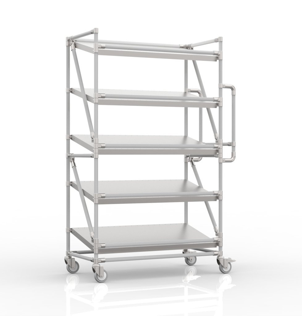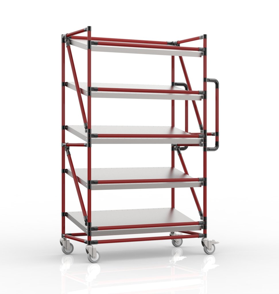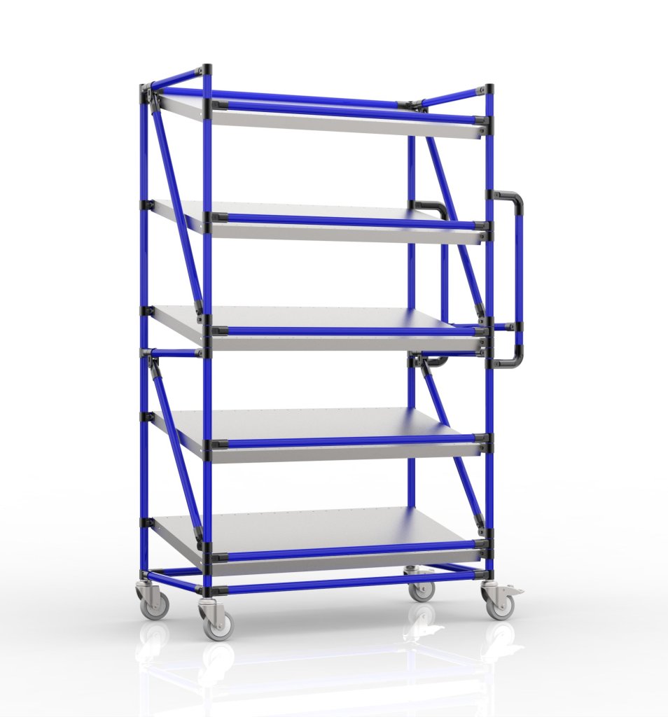 Wózek do skrzynek z pięcioma pochyłymi półkami jest praktycznym pomocnikiem przy transporcie w firmach produkcyjnych i centrach pełny opis i parametry