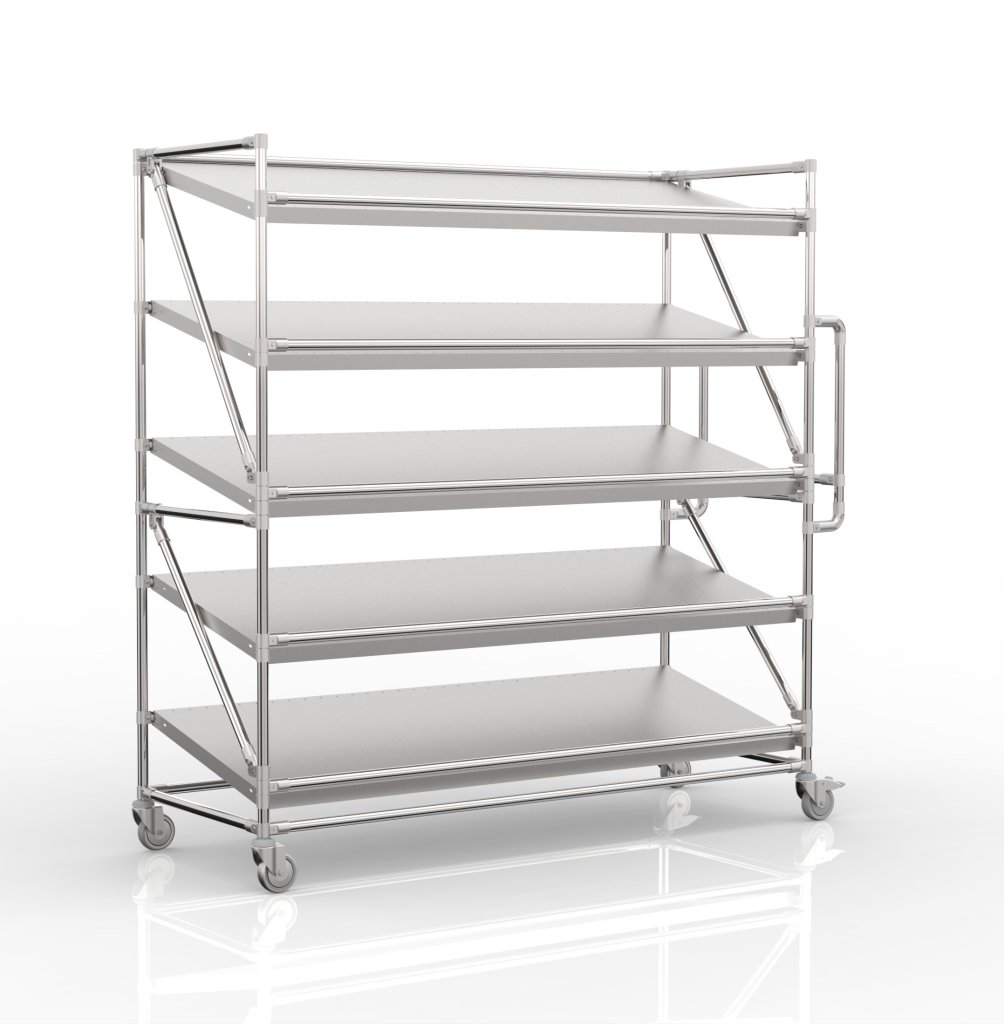 Wózek regałowy do skrzynek z pięcioma ukośnymi półkami to praktyczny pomocnik przy obsłudze w firmach produkcyjnych i centrach pełny opis i parametry