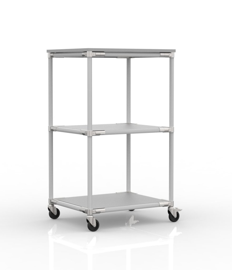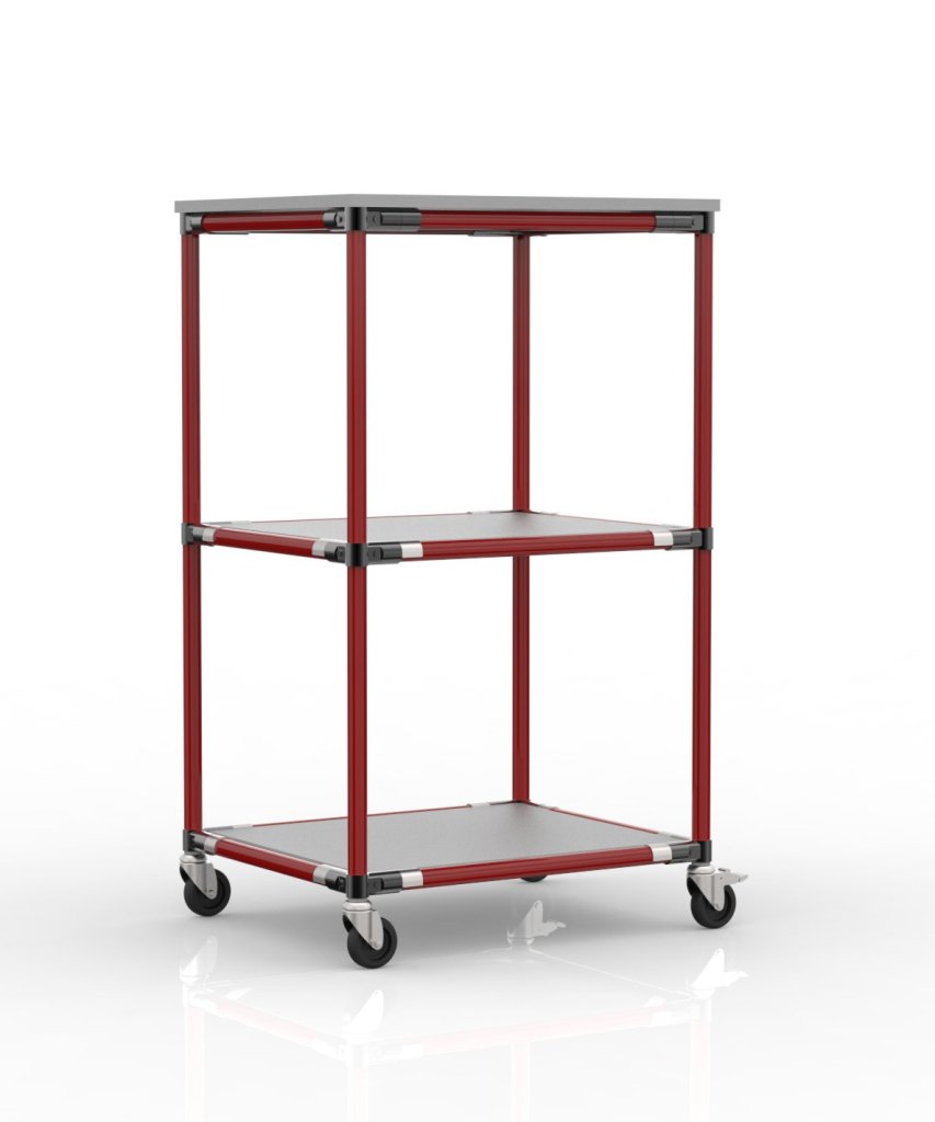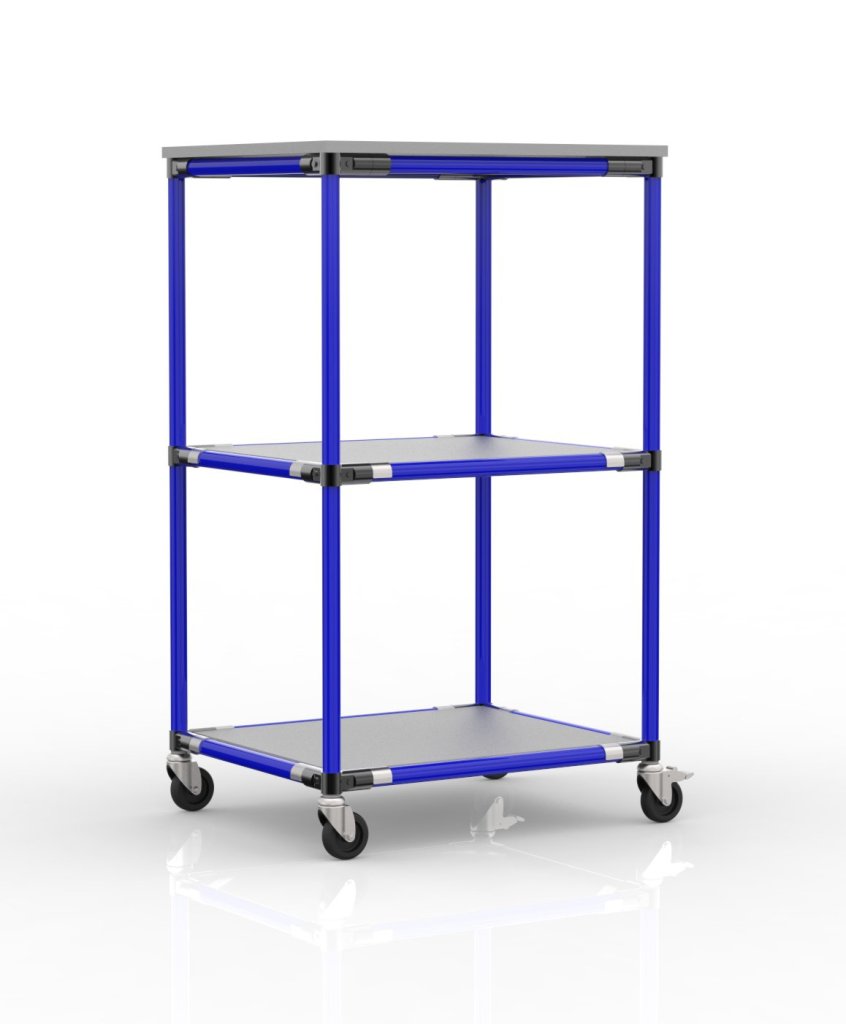 Wózek regałowy wykonany z rurowego systemu modułowego, odpowiedni do pomieszczeń przemysłowych, magazynów i hal produkcyjnych. Nadaje się do transportu towarów i materiałów. Płyta laminowana o grubości 18 mm, nośność wózka 150 kg, nośność podłogi 50 kg.