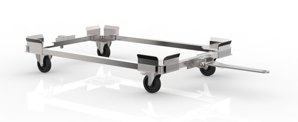 Podwozie manipulacyjne wykonane ze zmontowanych elementów stalowych o wymiarach 40x40 mm. Dzięki nośności do 750 kg idealnie nadaje się do transportu cięższych przedmiotów. 2 koła skrętne z hamulcem i 2 skrętne bez hamulca o średnicy 125 mm. Podwozie dostępne jest w kilku wariantach – powierzchnia ocynkowana lub kolorowy lakier. Wymiary 350 x 840 x 1350 mm.