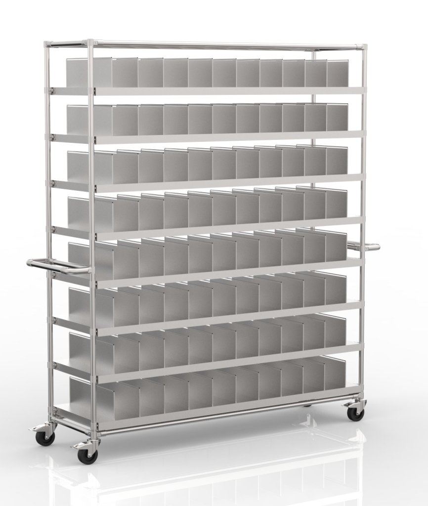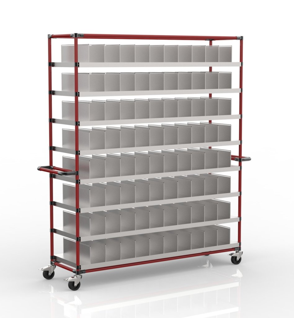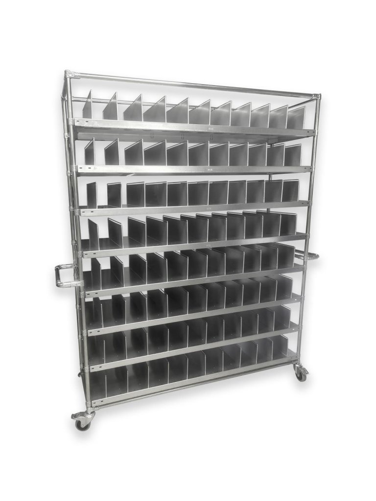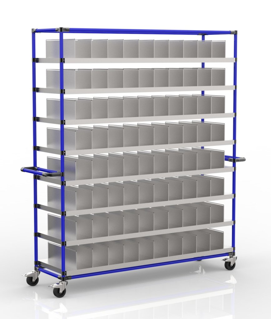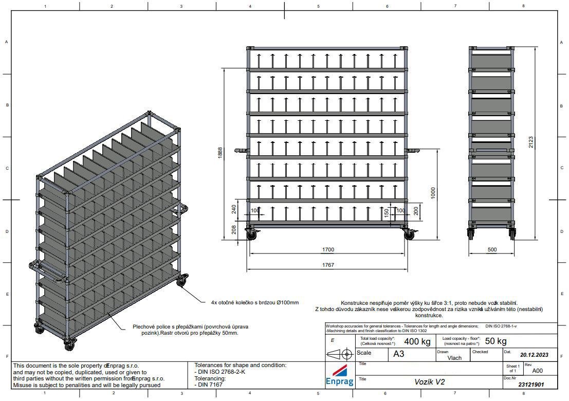 Wózek przeładunkowy do transportu różnego rodzaju części z modułową przegrodą. Wózek wyposażony jest w metalowe półki z cynkowym wykończeniem. Półki służą do indywidualnych ustawień dla różnych rozmiarów części. Wymiary wózka 2123 x 1767 x 500 mm. Nośność podłogi konstrukcyjnej wynosi 50 kg, nośność całkowita wynosi 400 kg.
