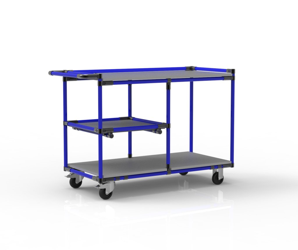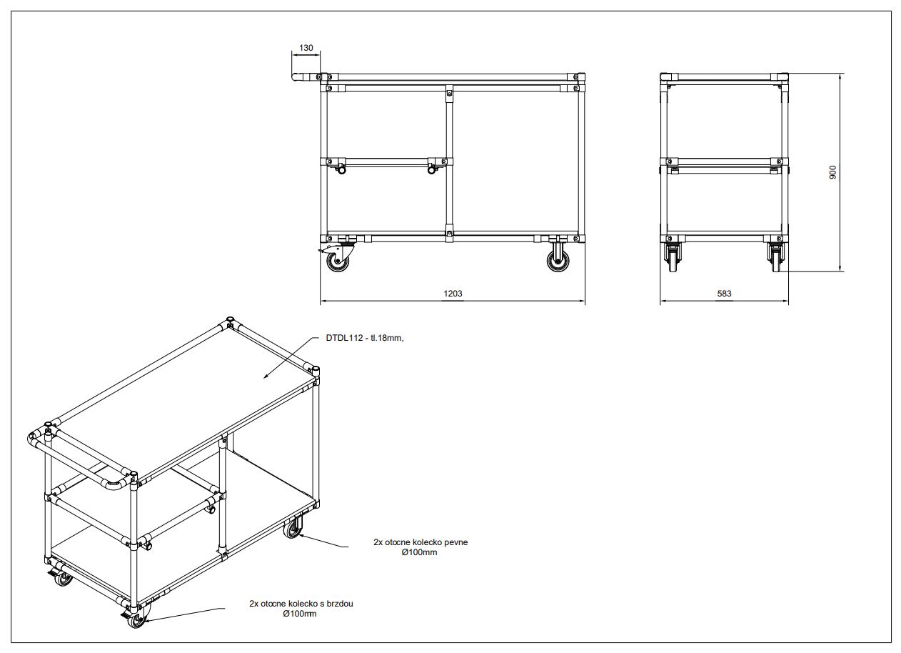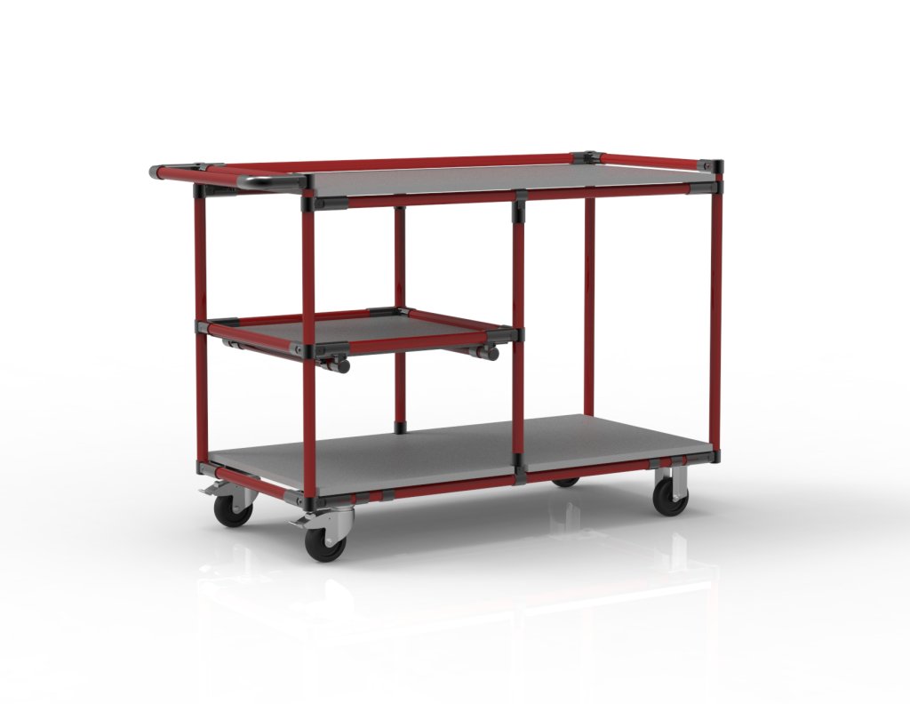 Wózek warsztatowy na narzędzia wykonany z rurowego systemu modułowego. Wózek wyposażony jest w laminowaną płytę wiórową o grubości 18 mm, która zapewnia solidną i stabilną powierzchnię do pracy. Wózek posiada cztery koła o średnicy 100 mm. Udźwig całkowity 250 kg, udźwig podłogi 100 kg. Wymiar 900 x 1333 x 583 mm.
