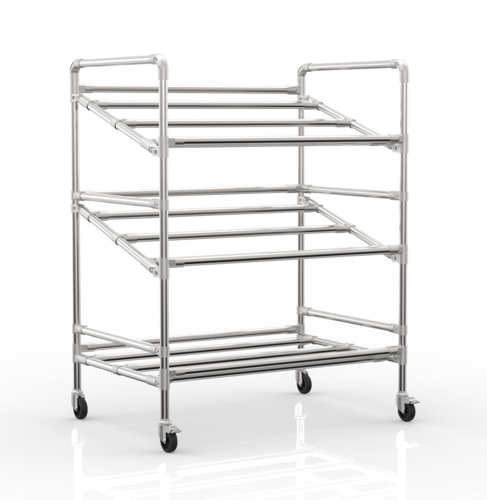 Wózek do skrzynek z jedną prostą i dwiema ukośnymi półkami praktyczny pomocnik przy obsłudze w firmach produkcyjnych i centrach logistycznych, szczególnie w obszarze e-commerce. Wózek zawiera dwa koła skrętne z hamulcem o średnicy 75 mm oraz dwa koła skrętne bez hamulca. Zaletą tych kół są niskie opory toczenia i dzięki temu wygodne prowadzenie. Istnieje możliwość zmiany konfiguracji kół w zależności od wymagań klienta. Całkowity udźwig 180 kg, udźwig na półce 60 kg. Wymiary 1250 x 972 x 670 mm.